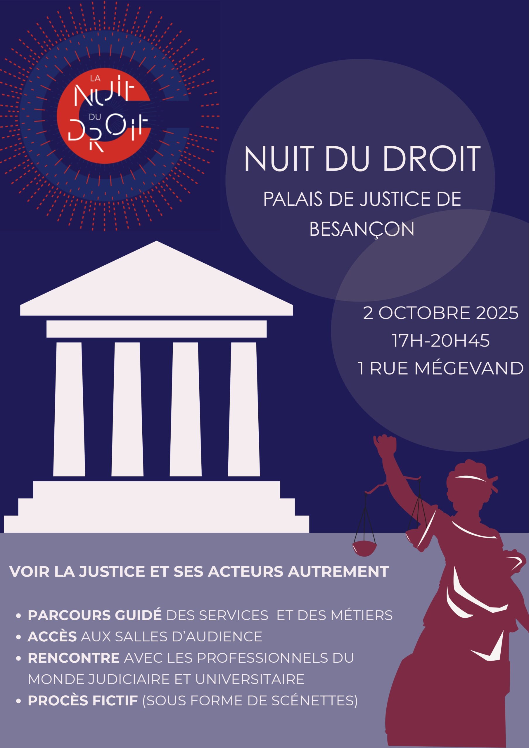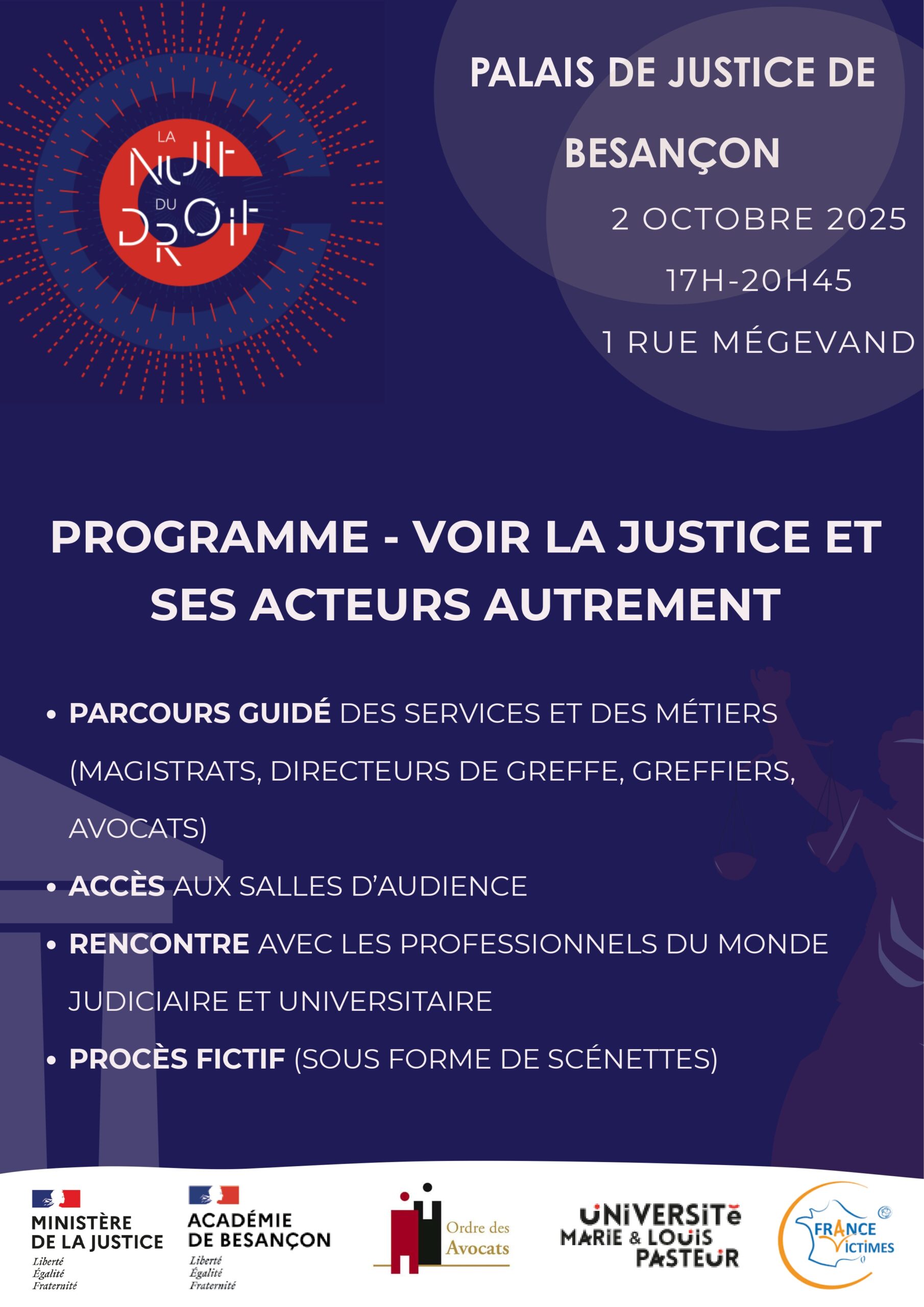 À l’occasion de la Nuit du Droit 2025, le jeudi 02 octobre, la Cour d’appel de Besançon et le Tribunal judiciaire de Besançon, en association avec le rectorat, l’Université Marie et Louis Pasteur, le Barreau de Besançon et l’association d’aide aux victimes organisent un événement au Palais de justice, réservé aux collégiens et lycéens.