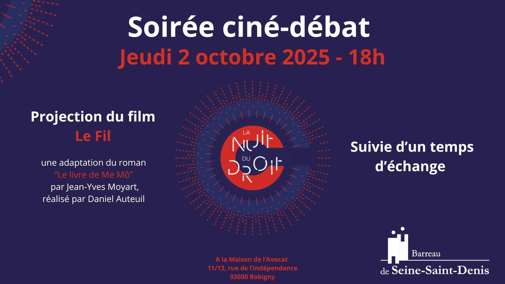 À l’occasion de la Nuit du Droit 2025, le jeudi 02 octobre, le Barreau de Seine-Saint-Denis a le plaisir de vous convier à une soirée ciné-débat.