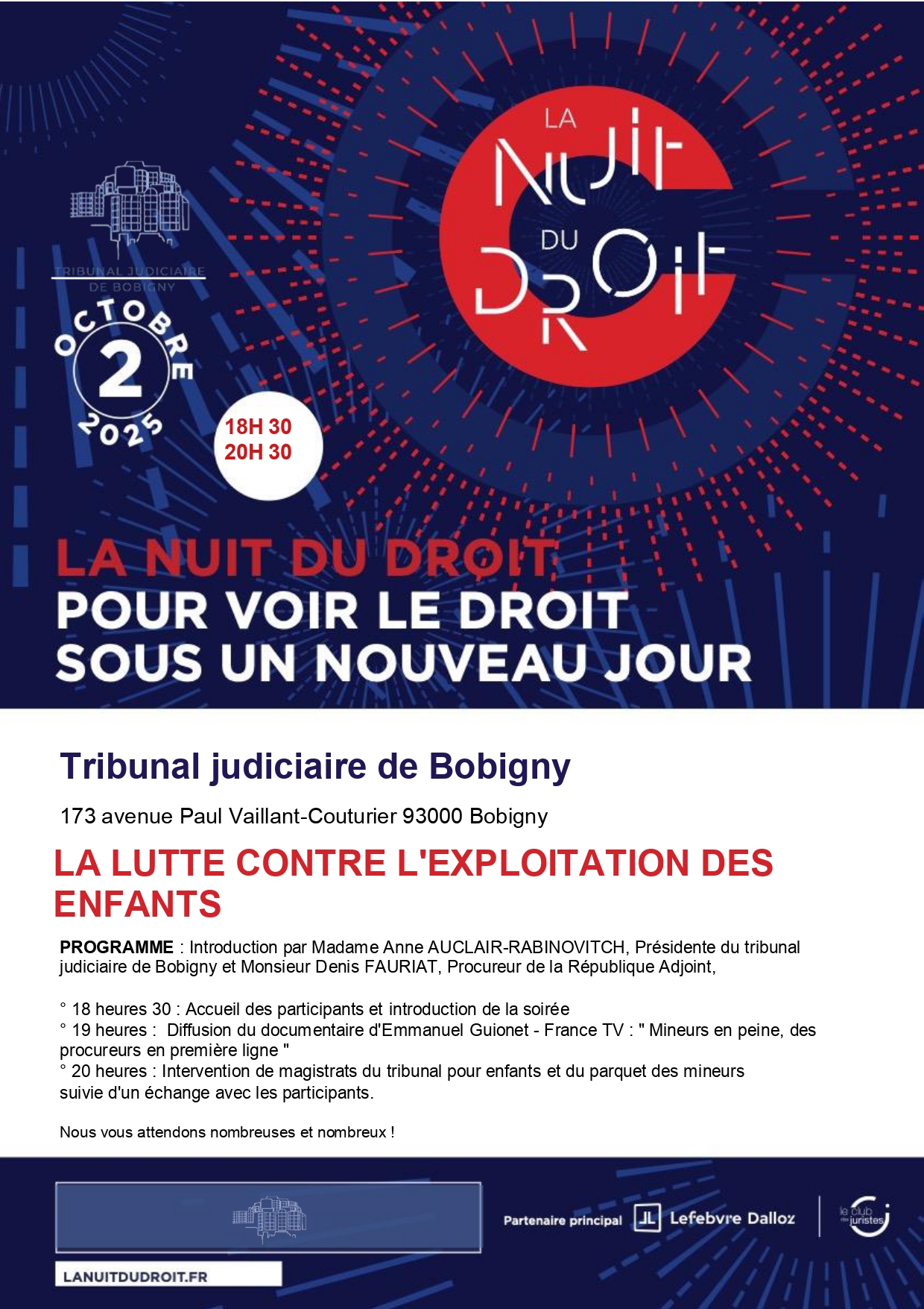 ♦ À 18 heures 30 : Accueil des participants et introduction de la soirée par Madame Anne AUCLAIR-RABINOVITCH, présidente du Tribunal judiciaire de Bobigny et Monsieur Denis FAURIAT, procureur de la République adjoint ;