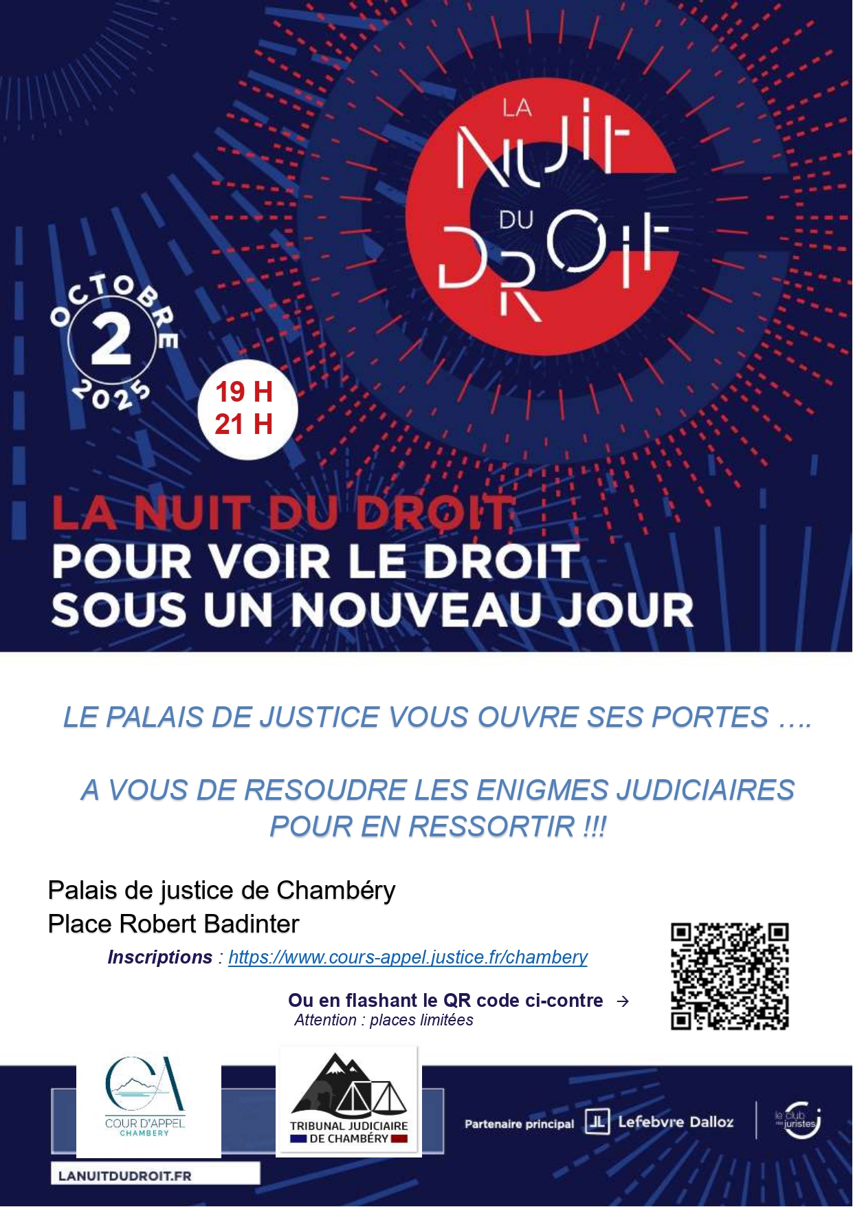 Événement gratuit, places limitées, inscription obligatoire en scannant le QR code ci-dessous ou sur le site de la Cour d’appel : cour-appel.justice.fr/chambery