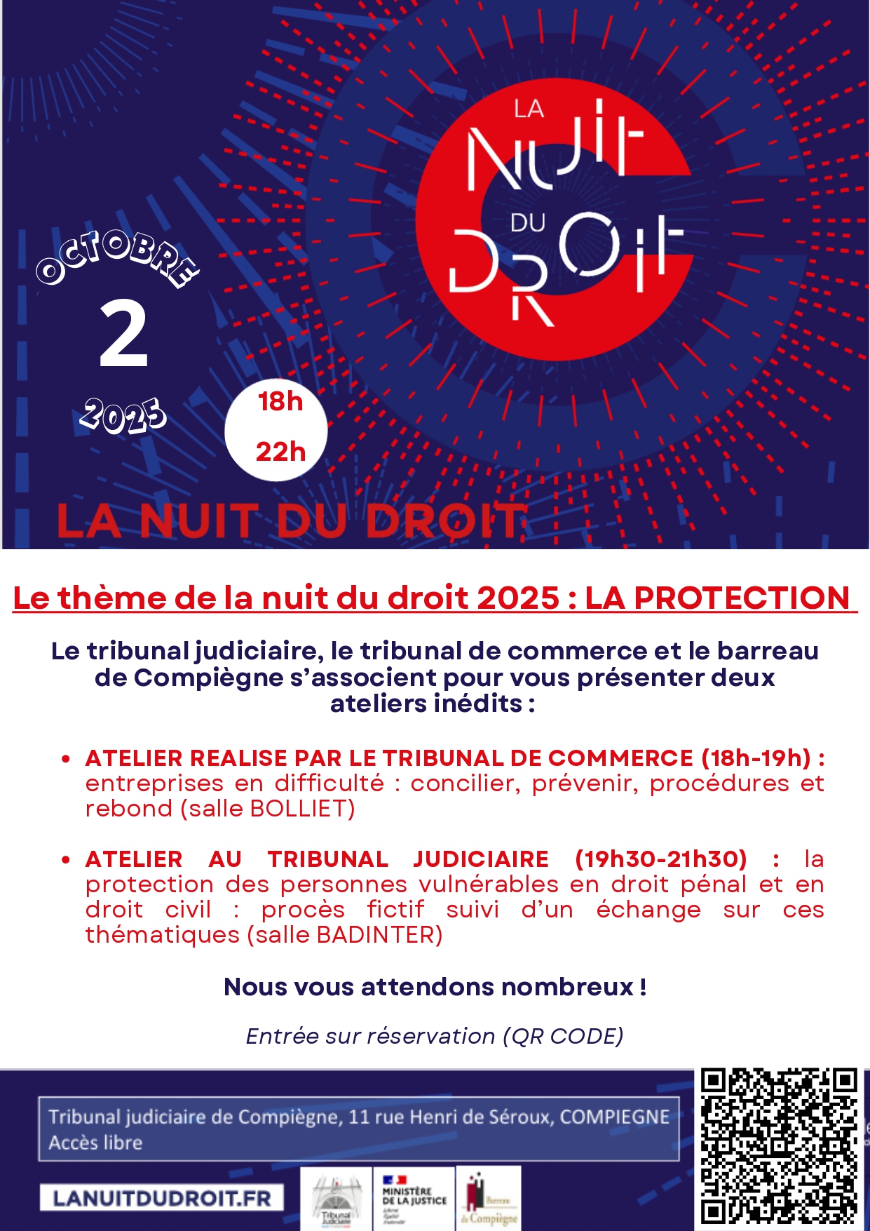 À l’occasion de la Nuit du Droit 2025, le jeudi 02 octobre, le Tribunal judiciaire de Compiègne, le Tribunal de commerce et le Barreau de Compiègne s’associent pour vous présenter deux ateliers inédits.