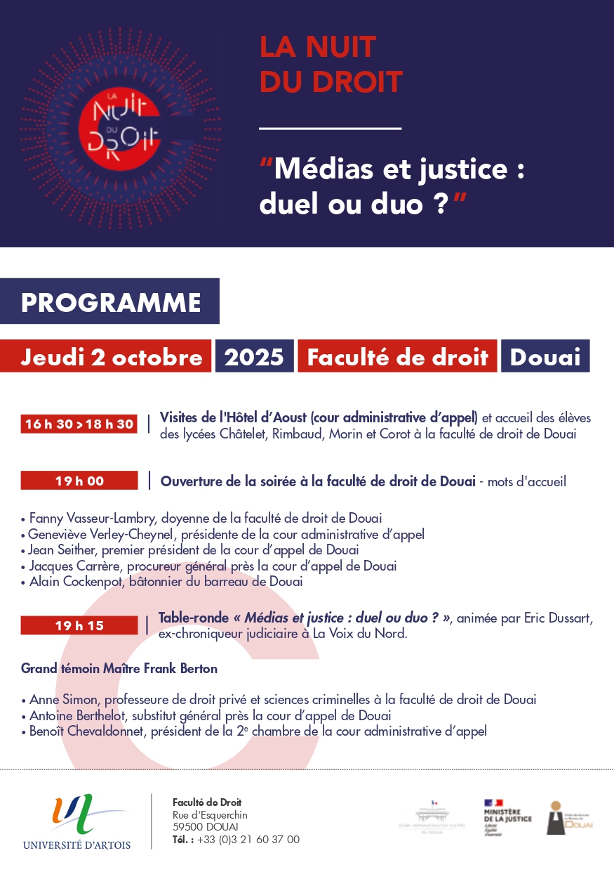 À l’occasion de La Nuit du Droit, le 02 octobre 2025, la Cour d’appel de Douai, le Tribunal judiciaire de Douai, la Cour d’administrative d’appel de Douai, le Barreau de Douai et la Faculté de droit de l’université d’Artois organisent plusieurs manifestations à la Faculté de droit sur le thème :