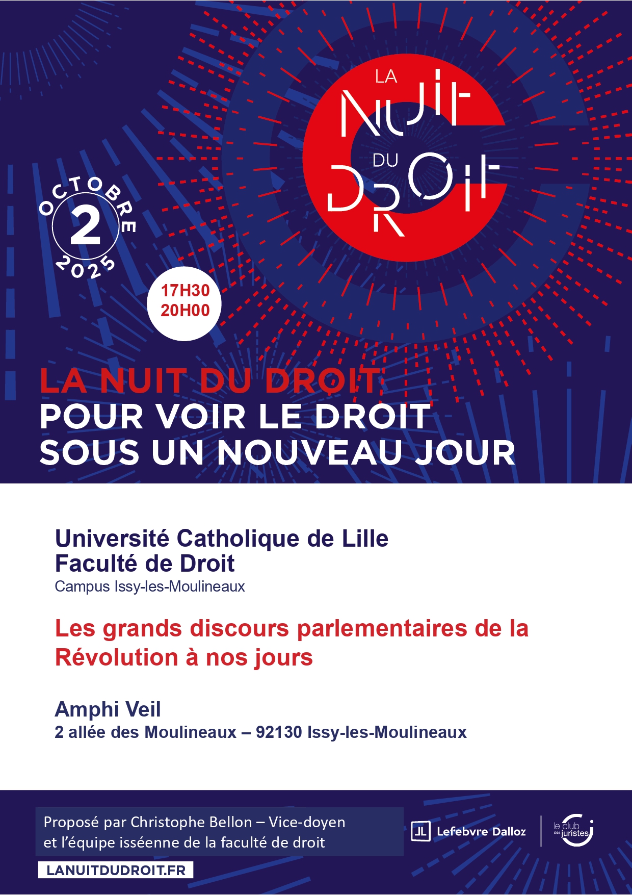 À l’occasion de la Nuit du Droit 2025, le jeudi 02 octobre, la Faculté de droit de l’Université Catholique de Lille, en partenariat avec le Campus d’Issy-les-Moulineaux, organise un événement autour des grands discours parlementaires.