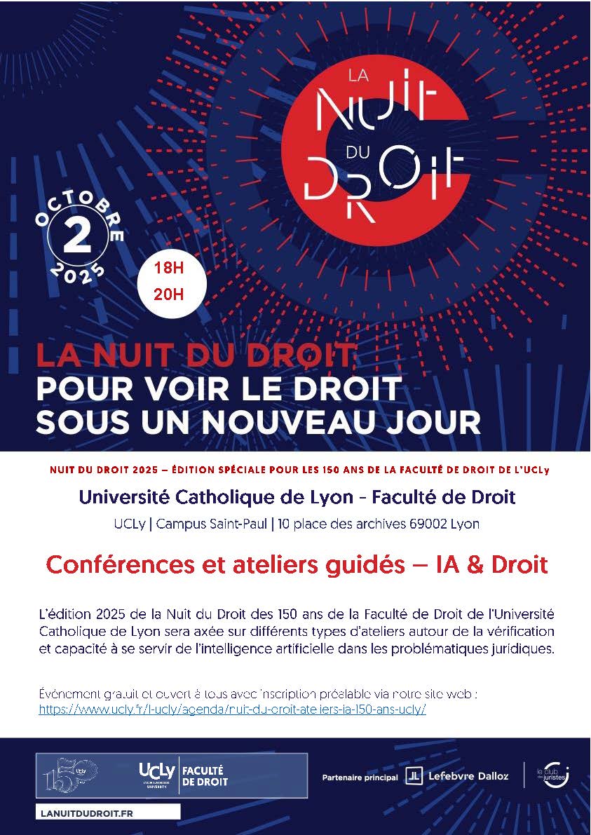 À l’occasion de la Nuit du Droit 2025, le jeudi 02 octobre, la Faculté de Droit de l’Université Catholique de Lyon a le plaisir de vous convier à une soirée inédite. Alors que cette année 2025 marque les 150 ans de l’Ucly et les 150 ans de la Faculté de droit, La Nuit du Droit sera pour nous l’occasion de questionner le lien I.A.- Droit ou plutôt, Droit – I.A.