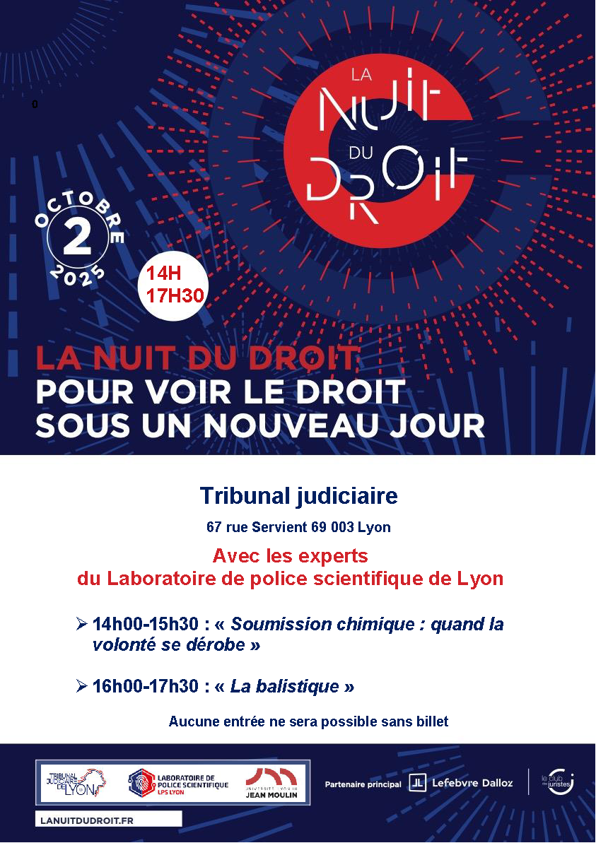 À l’occasion de la Nuit du Droit 2025, le jeudi 02 octobre, le Tribunal judiciaire de Lyon, la Faculté de droit de l’Université Jean Moulin Lyon 3 et le Laboratoire de Police scientifique de Lyon ont le plaisir de vous convier à deux interventions d’experts en toxicologie et en balistique.