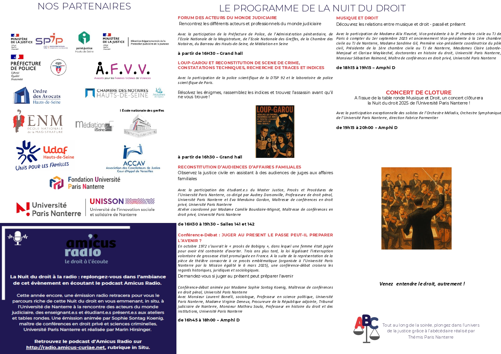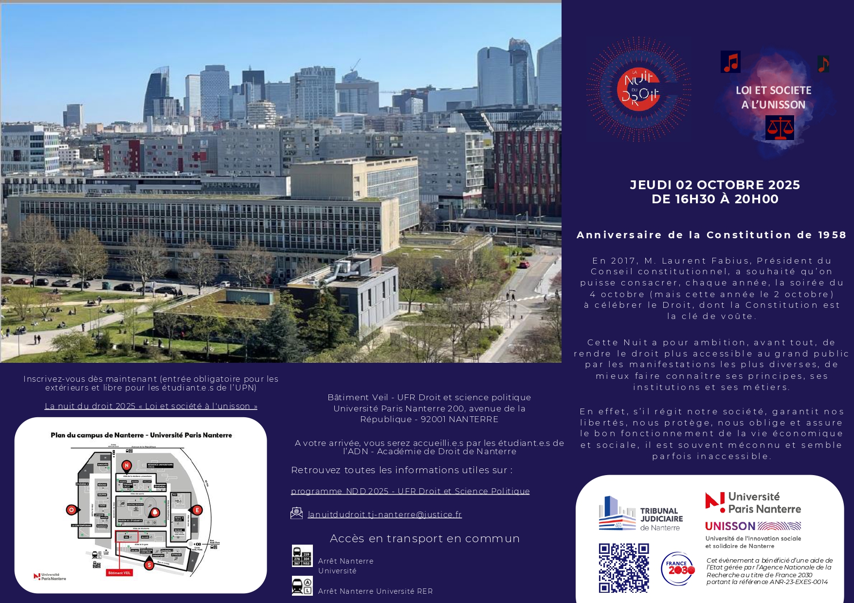 À l’occasion de la Nuit du Droit le jeudi 2 octobre 2025, l’Université Paris Nanterre a le plaisir de vous convier à une soirée inédite, festive et culturelle, organisée en partenariat avec le Tribunal judiciaire de Nanterre, la Préfecture de police, la Préfecture des Hauts-de-Seine, le Service pénitentiaire d’insertion et de probation des Hauts-de-Seine, l’École Nationale de la Magistrature, l’École Nationale des greffes, le Barreau des Hauts-de-Seine, la Chambre des Notaires des Hauts-de-Seine, l’Association des Conciliateurs de Justice de la Cour d’appel de Versailles, Le Conseil Départemental de l’Accès au Droit, Médiation en Seine et Avocats pour les Femmes Victimes de Violences.