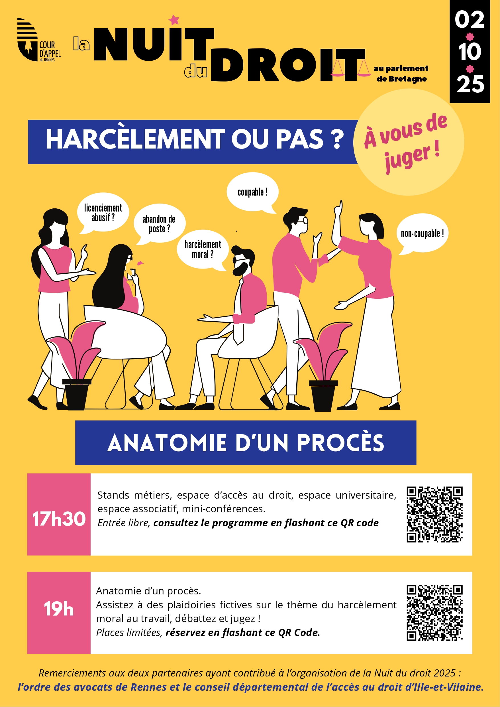 De 19H00 à 20h30, entrée gratuite avec réservation obligatoire en scannant le QR code de l’affiche ci-dessous ou sur le lien : Billets-Nuit-du-Droit-2025-Cour-dappel-de-Rennes