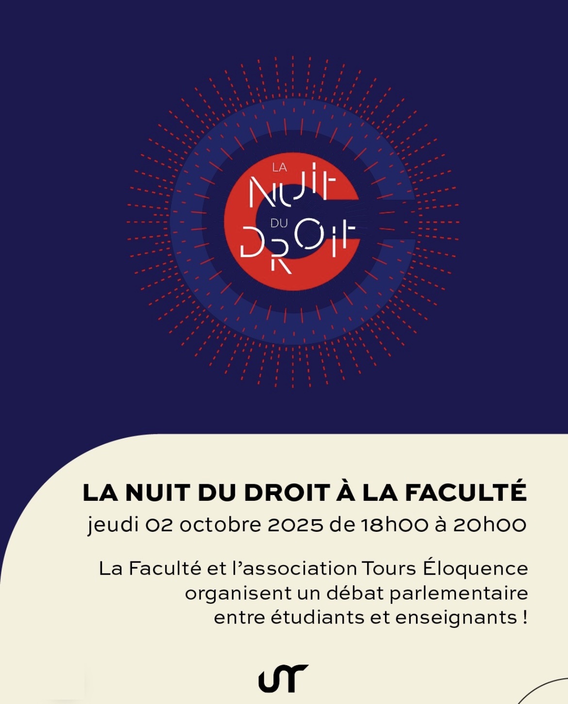 À l’occasion de la Nuit du Droit 2025, le jeudi 02 octobre, la Faculté de Droit, d’économie et de sciences sociales de l’Université de Tours, en partenariat avec l’Association étudiante Tours Éloquence, ont le plaisir de vous convier à une soirée pour vivre la démocratie autrement.