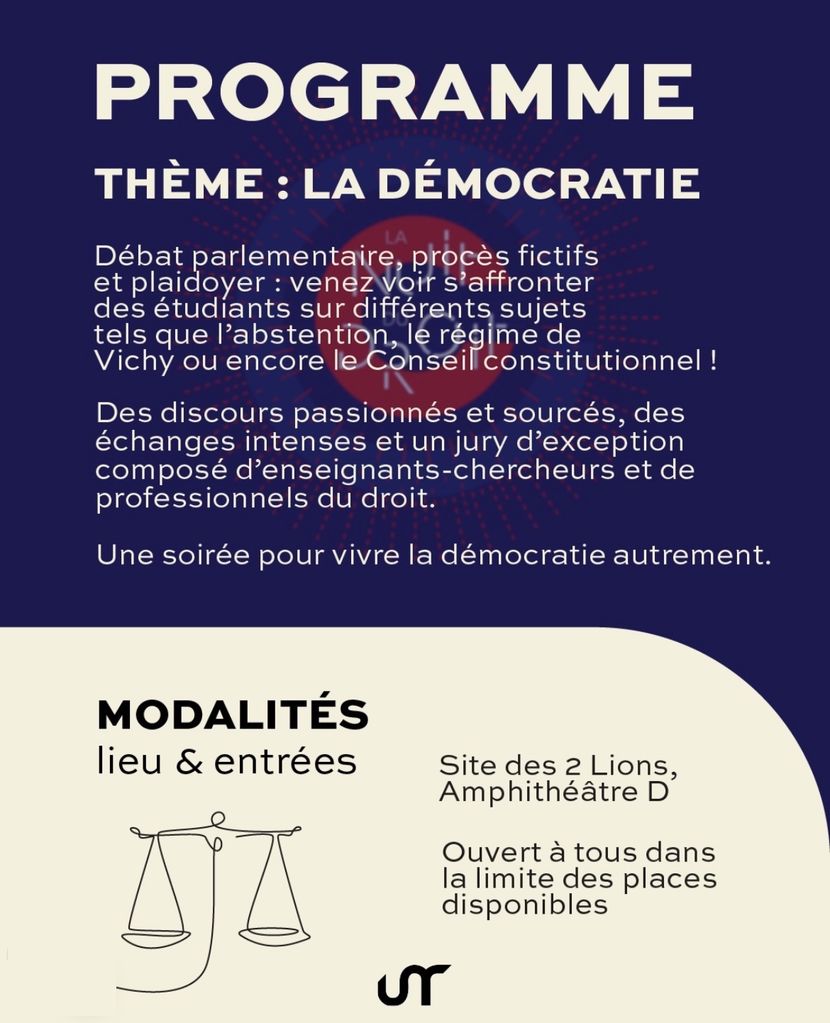 Débat parlementaire, procès fictifs et plaidoyer : venez voir s’affronter des étudiants sur différents sujets tels que l’abstention, le régime de Vichy ou encore le Conseil constitutionnel !